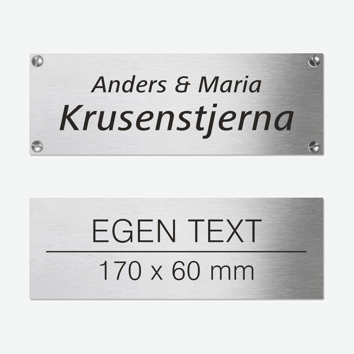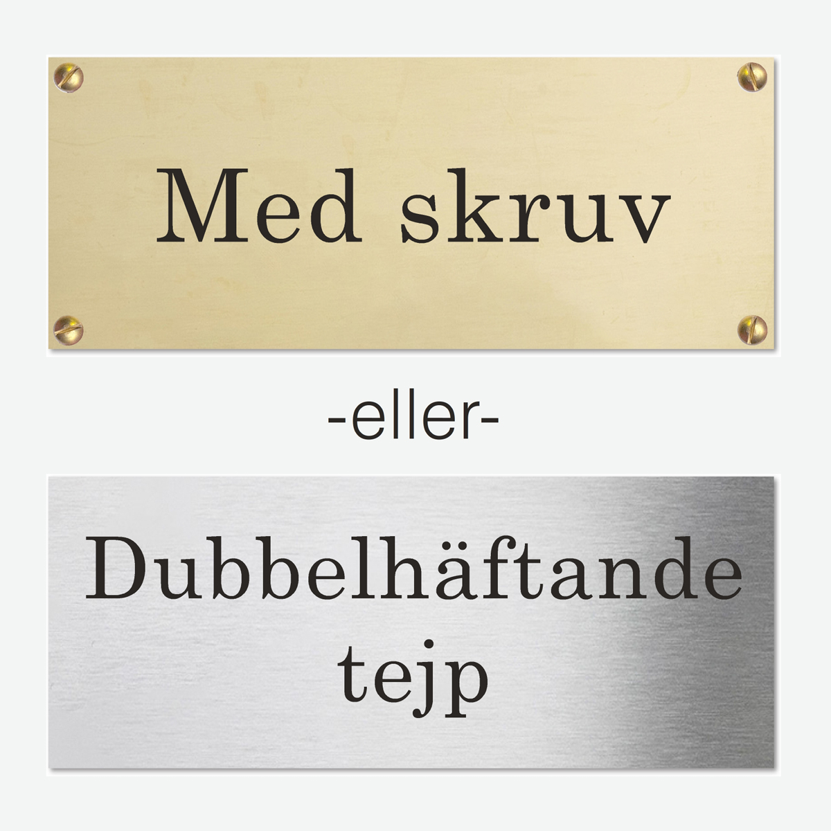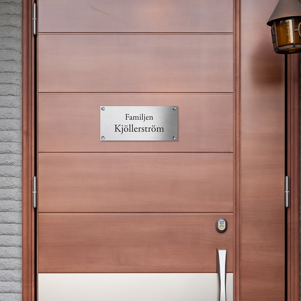 Mycket stilren dörrskylt i borstat rostfritt stål som graveras med valfri egen text eller annan önskad design. Gravyren färgfylls med specialfärg som finns i flera standardkulörer. Dörrskylten levereras med skruv eller dubbelhäftande tejp för en enkel montering. Skylten är lämpad för såväl inomhus som utomhusbruk. Finns flera storlekar.